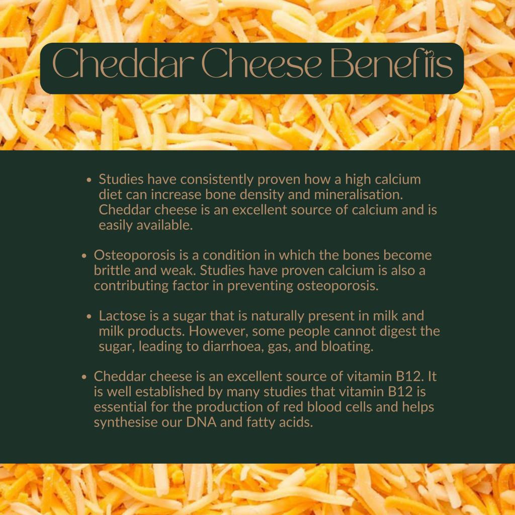 Increase Bone Density: Studies have consistently proven how a high calcium diet can increase bone density and mineralisation. Cheddar cheese is an excellent source of calcium and is easily available.