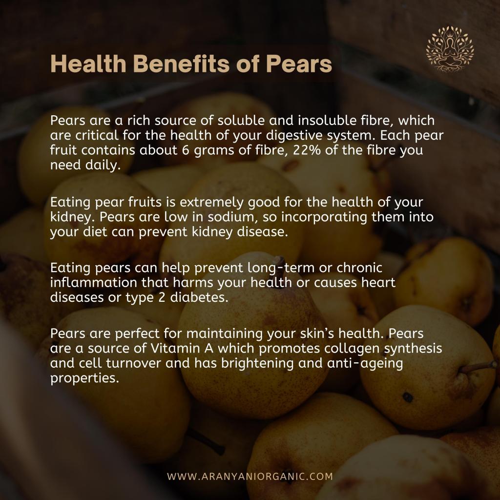 Eat Pears for a Smooth Digestion: The prime health benefit of eating a pear is that it helps to get smooth digestion. It is rich in dietary fibre and hence helps to enhance the function of the digestive system. Eating pears also help in reducing the symptoms of constipation and IBS.